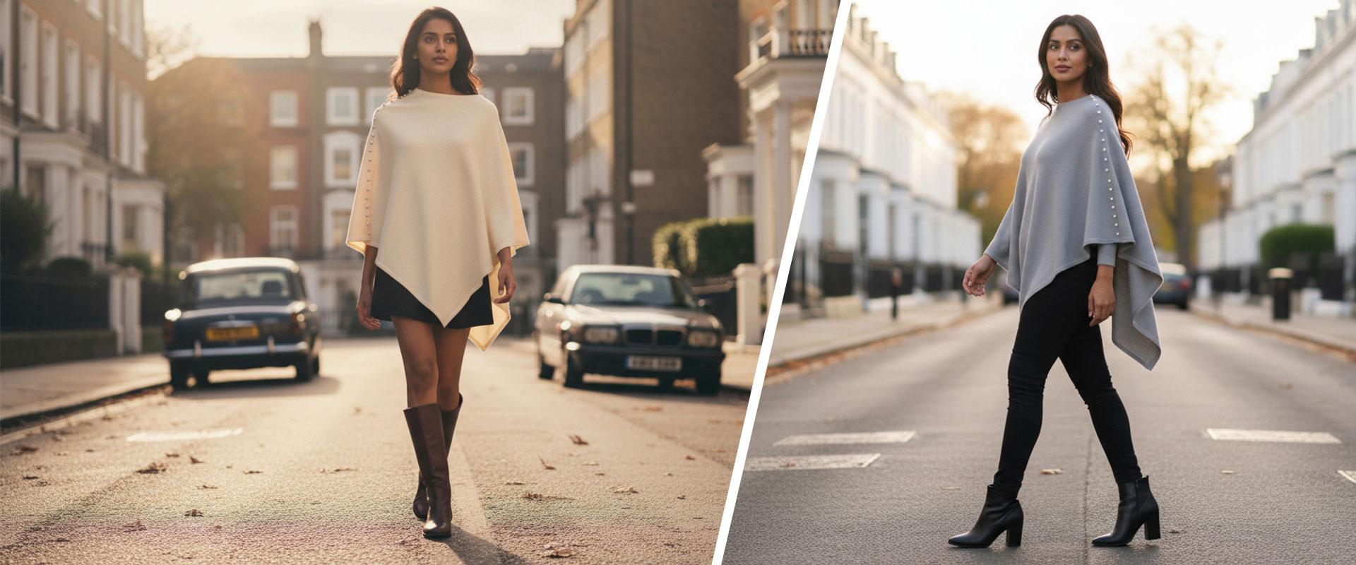 Our wool knit ponchos combine comfort and sophistication, featuring delicate pearl detailing along the shoulder. Each poncho is crafted from a high-quality wool blend, offering warmth without bulk. With five colours to choose from, these one-size pieces make versatile additions to your wardrobe for both casual days and party looks.